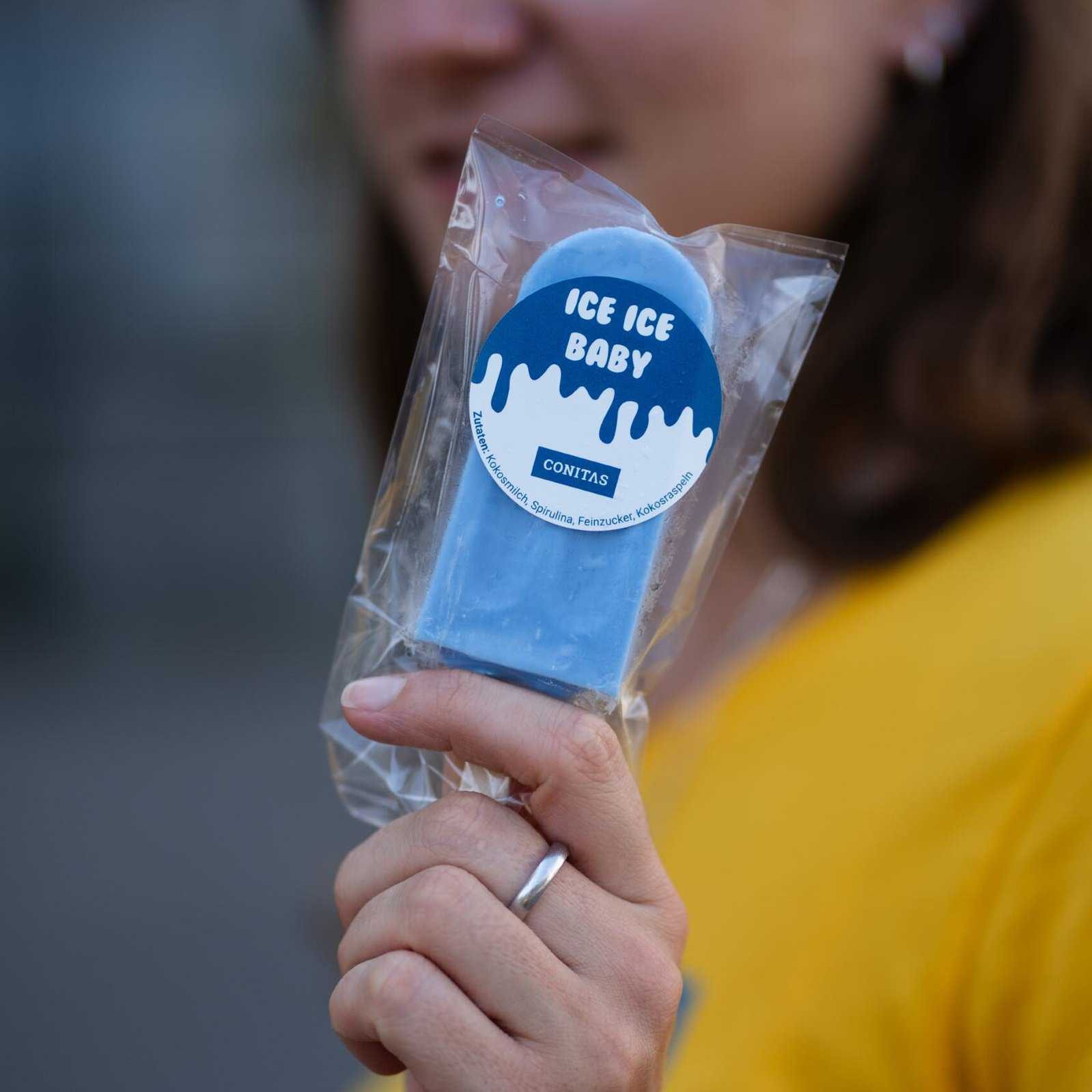 Als süßer Anreiz, den sommerlichen Info-Stand zu besuchen, diente ein eigens für die Aktion hergestelltes Eis. Dieses war in Zusammenarbeit mit Popice entstanden. Popice ist eine Eis-Manufaktur aus Karlsruhe, die handgemachtes Eis am Stiel aus echten Früchten und weiteren leckeren Zutaten herstellt. Das CONITAS-Eis war blau – passend zur Unternehmensfarbe – und bestand aus Kokosmilch, Kokosraspeln, Spirulina und Feinzucker.