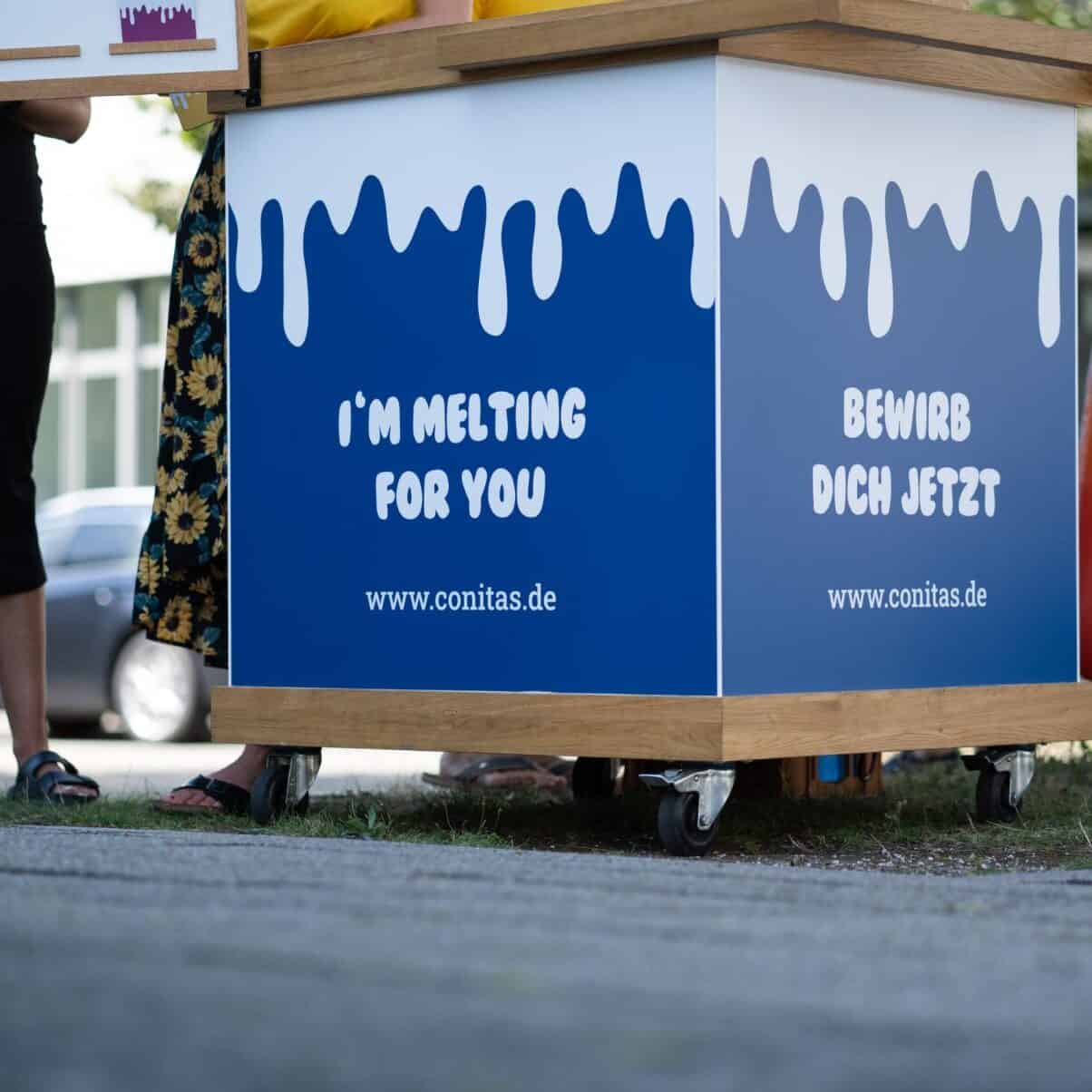 „Ein Eis für dich! Und on top noch nen Job?“ Mit Sätzen wie diesen machten die Teams von Recruiting und Marketing vergangene Woche auf die CONITAS aufmerksam. Dazu hatten die Kolleginnen und Kollegen einen sommerlichen Info-Stand am Technologiepark in Karlsruhe aufgebaut, sowie tags darauf am Alten Schlachthof in Karlsruhe: zwei Orte, an denen viele Digitalfirmen ansässig sind.