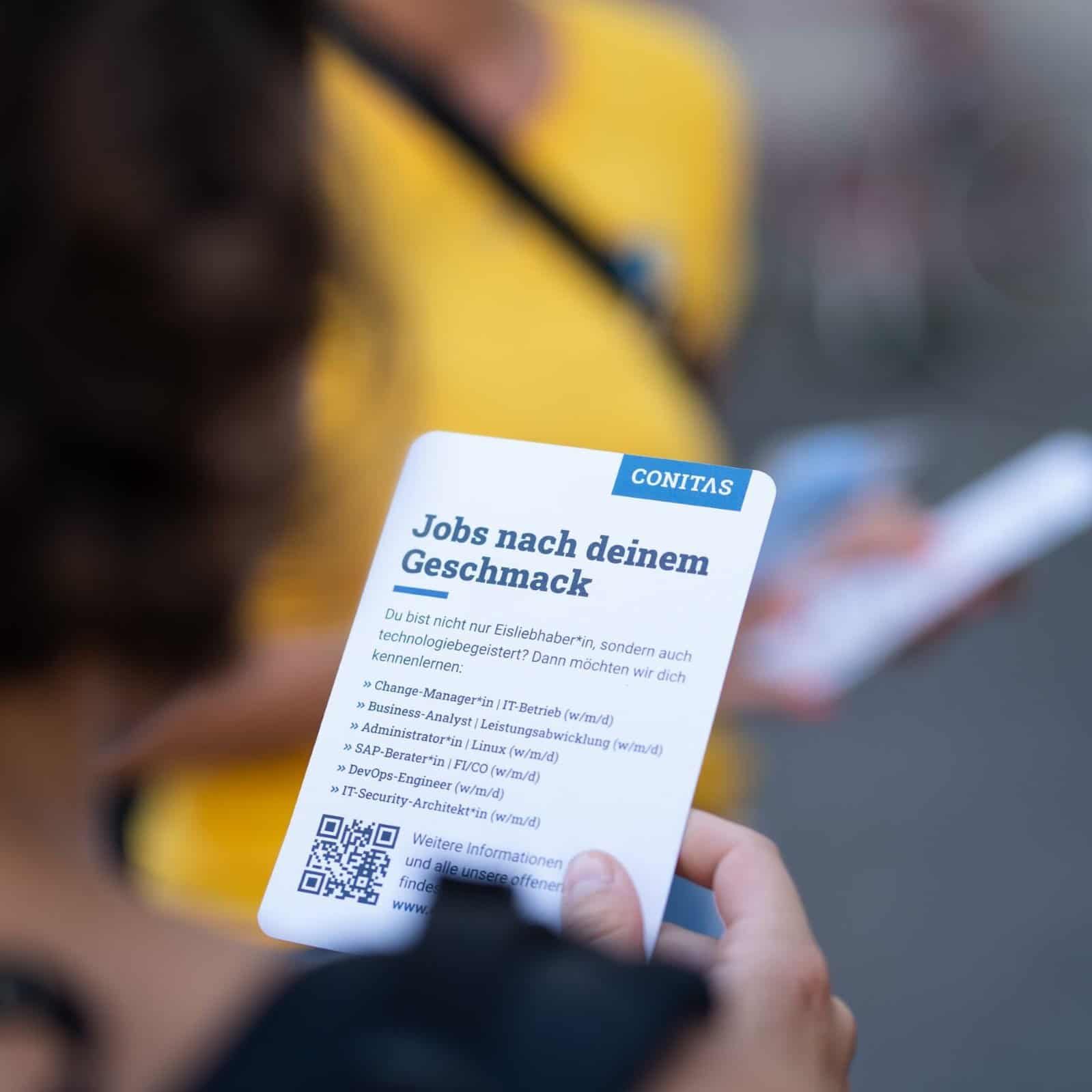 Neugierig waren die Passantinnen und Passanten nicht nur auf das blaue Eis, sondern auch auf die bunten Postkarten, die am Stand auslagen und auf denen offene Jobs bei der CONITAS beworben wurden. Mit einigen Interessentinnen und Interessenten ergaben sich erste Gespräche, in denen das Recruiting-Team die CONITAS genauer vorstellte und auch die zahlreichen Benefits hervorhob, welche das Unternehmen bietet, wie beispielsweise einen sicheren Job im Umfeld des öffentlichen Dienstes und die sinnstiftenden Tätigkeiten.