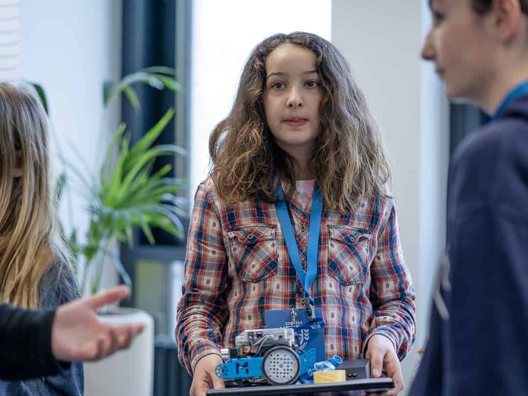 Es war ein spannender Wettkampf: am Schluss gewann Team Swift mit seinem mBot „Martin“. Der kleine Roboter hatte es geschafft, seinen aufgesteckten Luftballon gegen die anderen Mini-Maschinen erfolgreich zu verteidigen. Die Challenge war Teil des Girls’Day-Events der CONITAS, am 27. April im Steinbeis-Haus in Karlsruhe. 17 Schülerinnen zwischen 10 und 15 Jahren aus der Karlsruher Umgebung waren hochmotiviert am Start.