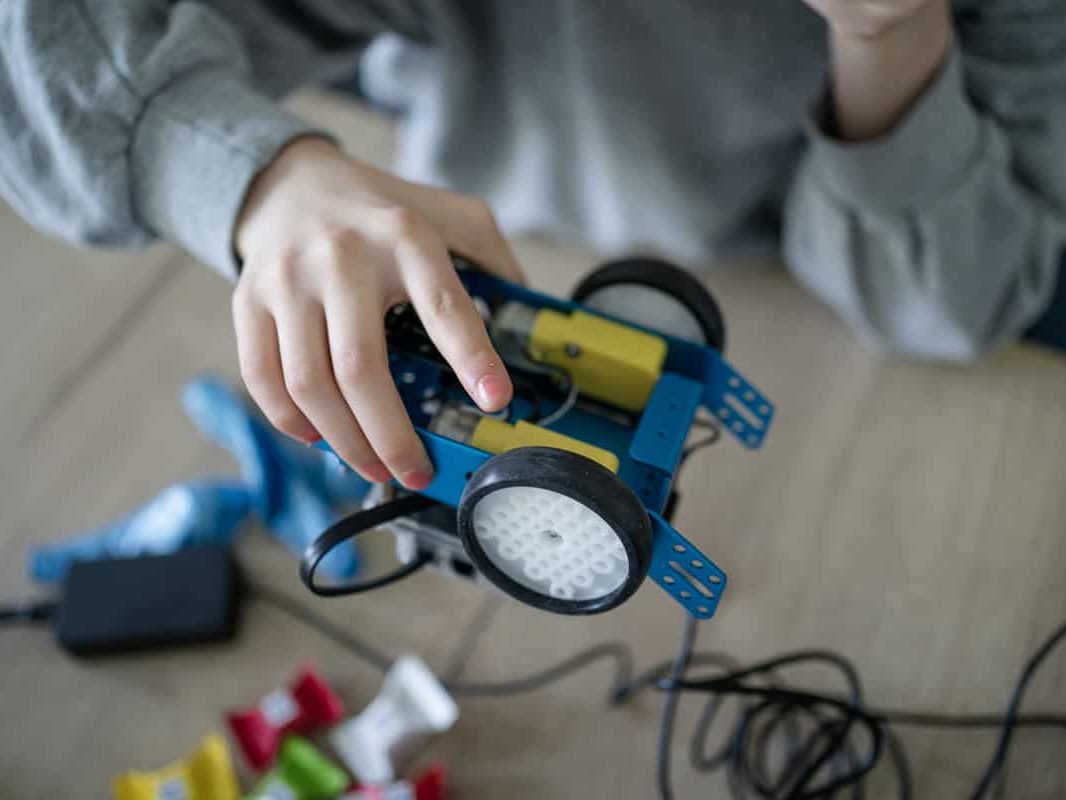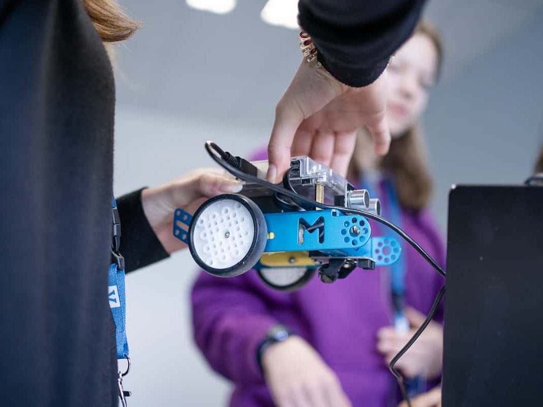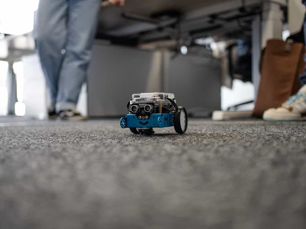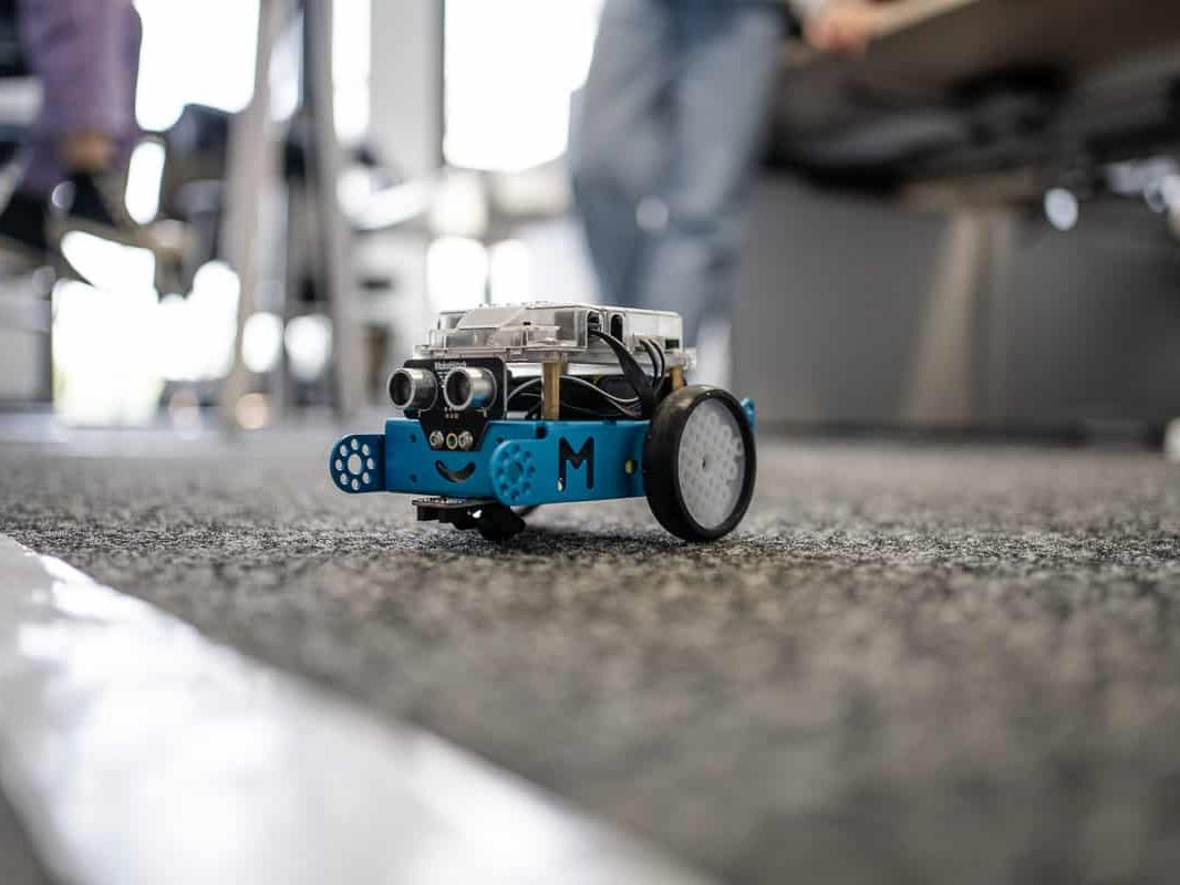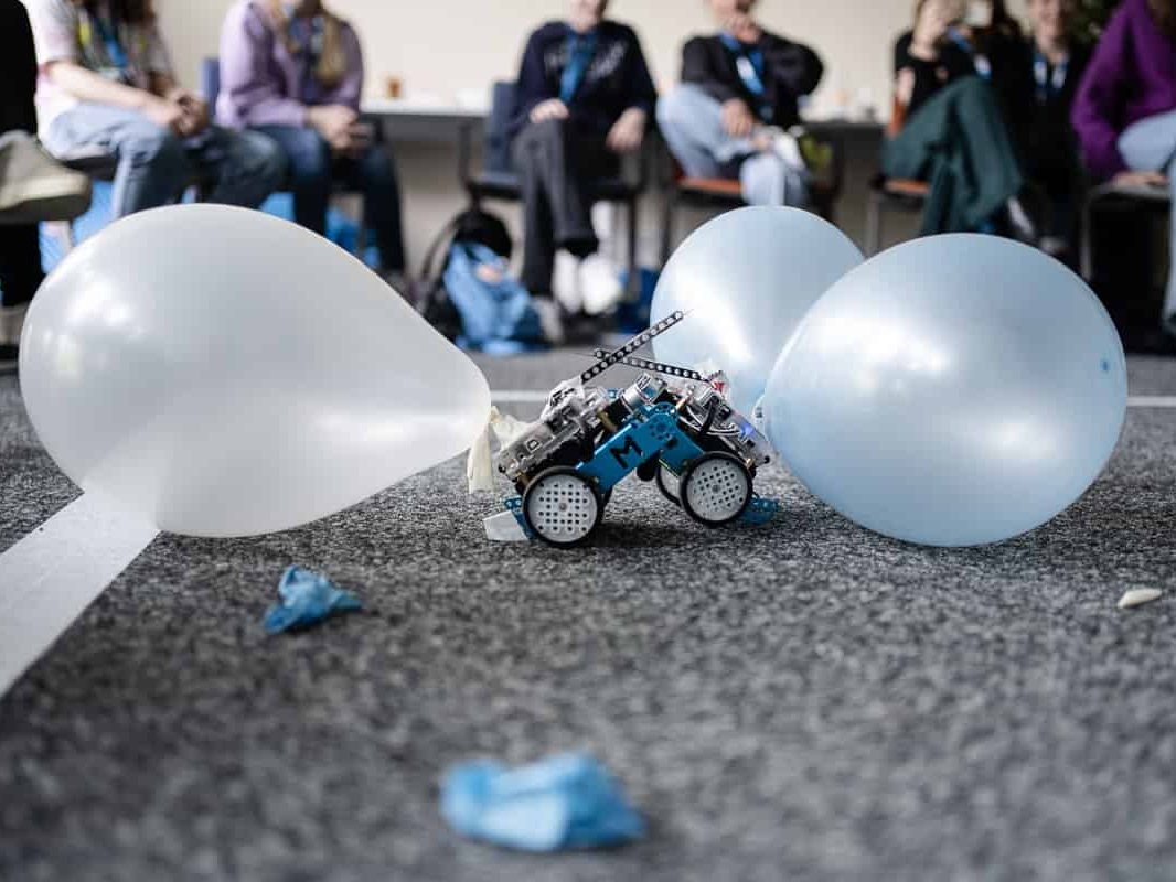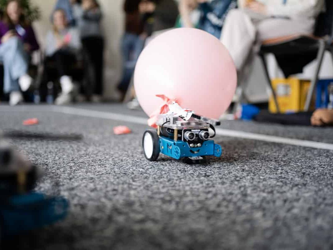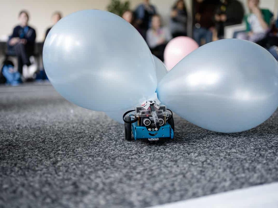 In der anschließenden Challenge sollten die mBots nun unter Beweis stellen, wie gut sie programmiert worden waren. Jeder mBot bekam einen Luftballon aufgesteckt, sowie eine kleine Nadel: mit dieser sollten die gegnerischen Luftballons zum Platzen gebracht werden. Der Roboter sollte so programmiert werden, dass er zum einen innerhalb der sogenannten “Arena” (ein großes weißes Quadrat) bleibt und zum anderen, dass er die gegnerischen Luftballons zerstört und den eigenen behält. Welche Strategie – ob offensiv oder defensiv – der Roboter dabei verfolgte, hing von der Programmierung der Mädchen ab. Manch einer nahm also volle Fahrt auf, sobald er einen anderen Roboter erkannte, andere dagegen gingen in die Flucht.